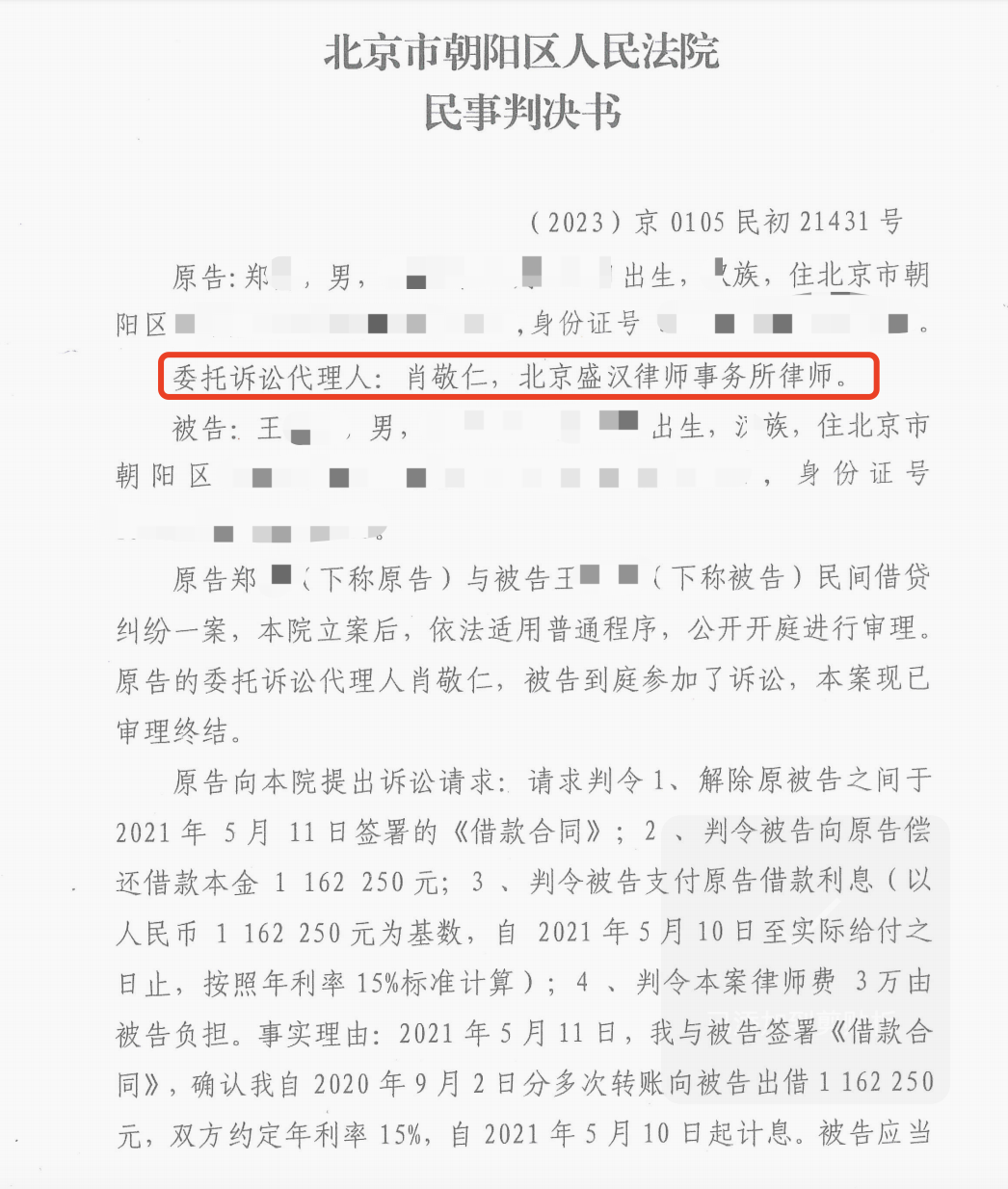 经过盛汉律师的不懈努力,得到了法院的全方面支持,不仅解除了原被告签订的《借款合同》还判令被告偿还原告借款本息以及律师费用。
