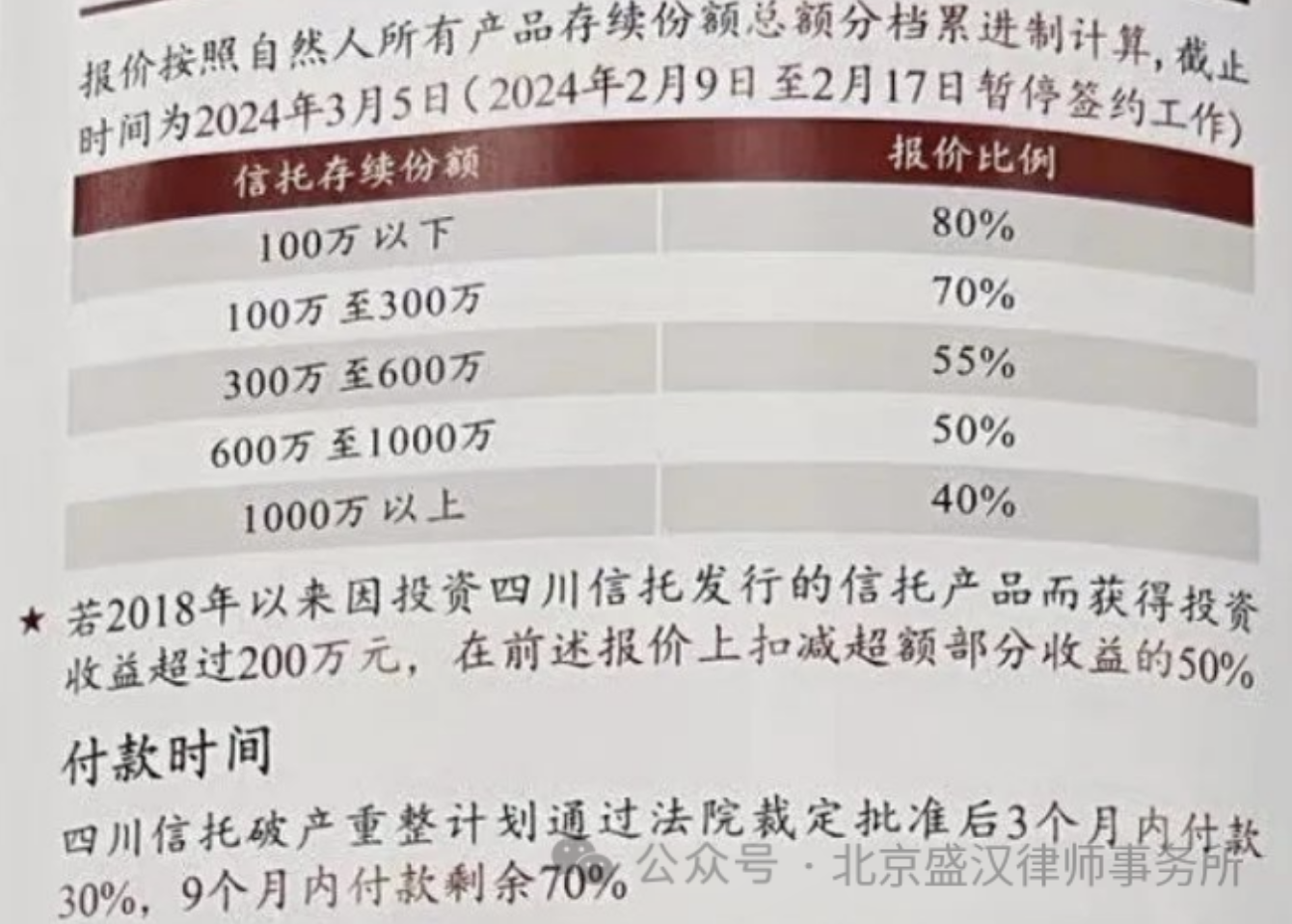 只不过,这个“全额付款”是打了折扣的,并且对于大额投资者更加不利。不仅兑付时间更长,打折比例更大,同时还采用了所有产品存续份额总额分档累进制计算。